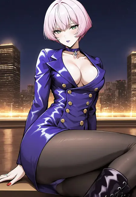 jenny burtory, jenny burtory \(bloody roar 2 leather blazer dress\), 1girl, solo, white skin, collarbone, cleavage, large breasts, pale pink hair, bob cut, green eyes, lavender lipstick, sliver ring, red nails, navy choker, navy leather blazer dress, ten gold buttons, navy pantyhose, lavender knee high-heeled boots