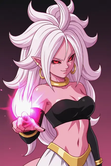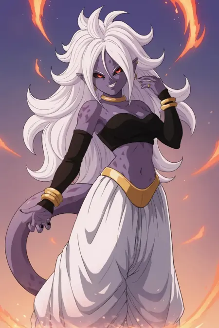 android 21, majin, pink skin, pointy ears, majin eyes, nail polish, black nails, long hair, white hair, majin tail,
