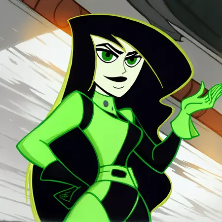 Shego: shmeikgo, black hair, long hair, green eyes, gloves, bodysuit, lipstick