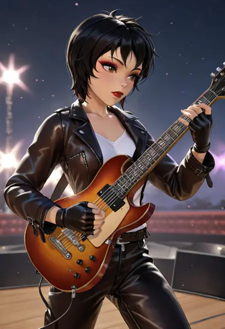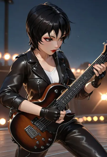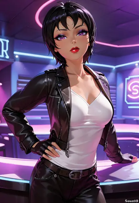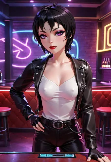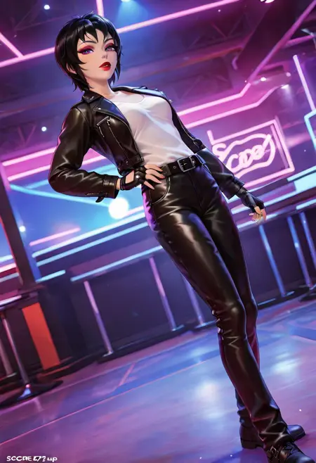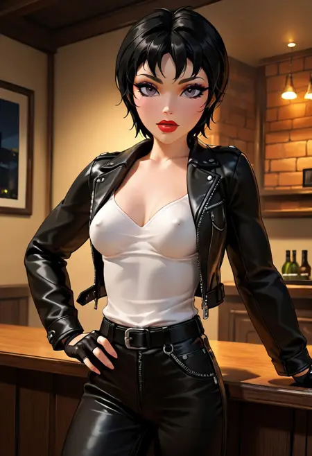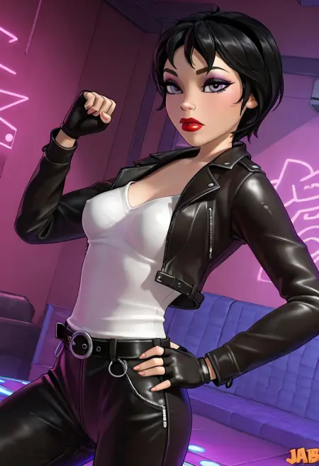 1girl, solo, suzi_camaro, pale-skinned, black_hair, jacket, leather_jacket, fingerless_gloves, leather_pants, leather belt, belt, leather, short_hair, white shirt, makeup, red lips, 3d, cartoon