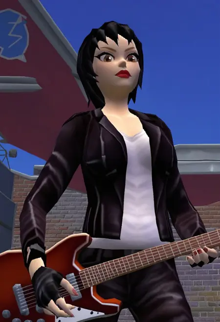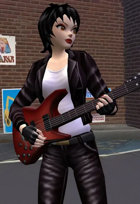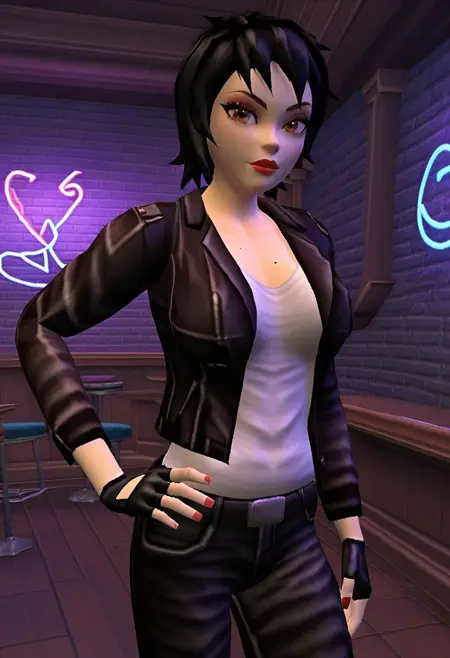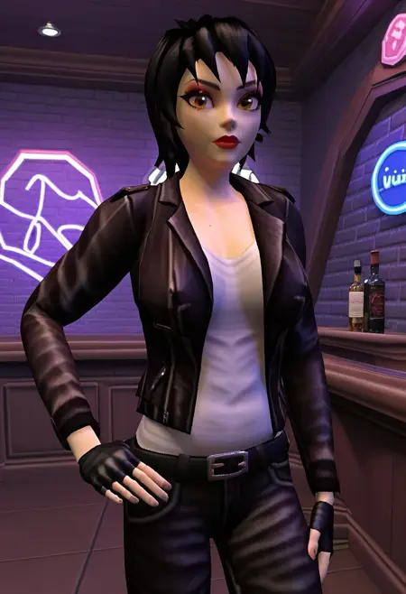 1girl, solo, suzi_camaro, 皮肤苍白, 黑发, 夹克, 皮夹克, 无指手套, 皮裤, 皮带, 皮带, 皮革, 短发, 白色衬衫, 妆容, 红唇, 3d, 卡通
