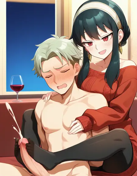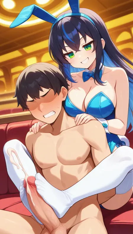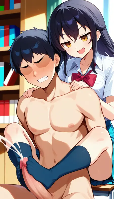 rearfj, hug, two-footed footjob, 1boy, penis, clothed female nude male, arms behind back, ejaculation, projectile cum