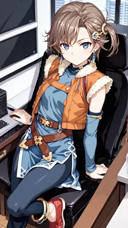Outfit:jewelry, earrings,belt, detached sleeves, vest,turtleneck,dress, fur trim, shoes,open clothes,anklet,side slit,leggins,