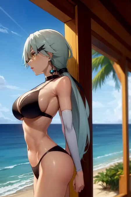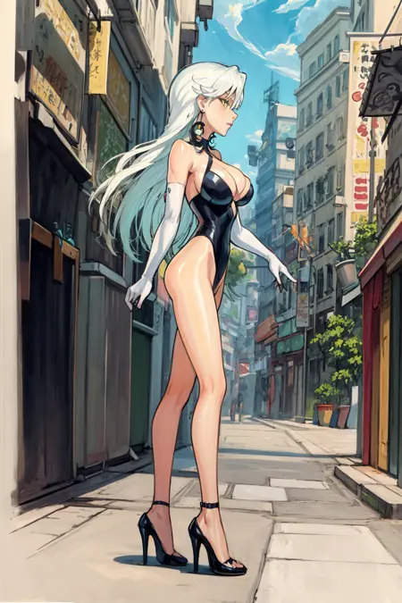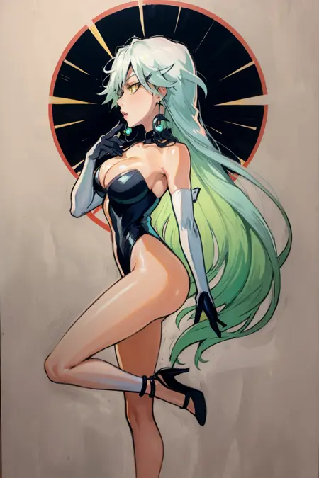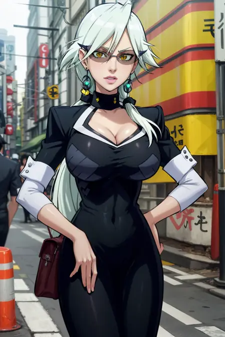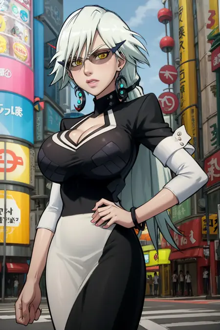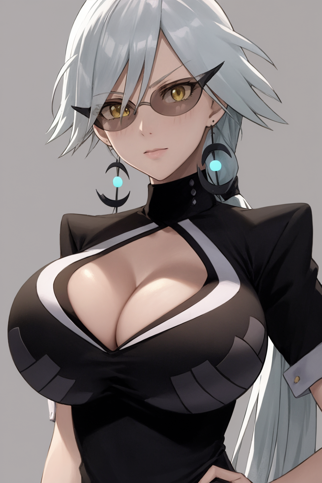 기타 프롬프트: 흰색 머리카락, 긴 머리카락, 큰 가슴, 가슴 절개, 옷 절개, 달 모양 귀걸이, 노란 눈, 드레스, 립스틱, 말머리, 메이크업