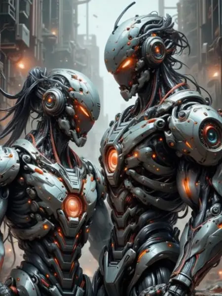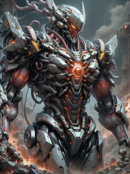 - 추천: 기술 메카, 중간 각도에서 본 로봇이 도시 풍경 앞에 서 있습니다. 로봇의 몸체는 흰색과 검은색 갑옷으로 장식되어 있으며, 로봇의 눈은 오렌지색 빛을 발산하여 단조로운 배경에 화려한 색감을 더합니다. 배경은 어둡습니다.