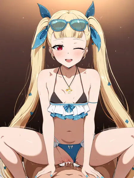 achates \(azure sea\) \(epic seven\), blonde hair, very long hair, twintails, blunt bangs, red eyes, hair ribbon, bikini, sunglasses, eyewear on head, necklace, nail polish, midriff, small breasts