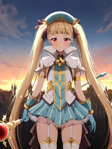 achates \(epic seven\), blonde hair, very long hair, twintails, blunt bangs, red eyes, hair ribbon, hat, skirt, gloves, white thighighs, garter straps, capelet