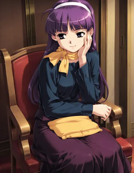 kumiyama shigeno: kumiyama, white hairband, yellow scarf, long sleeves, blue shirt, purple skirt