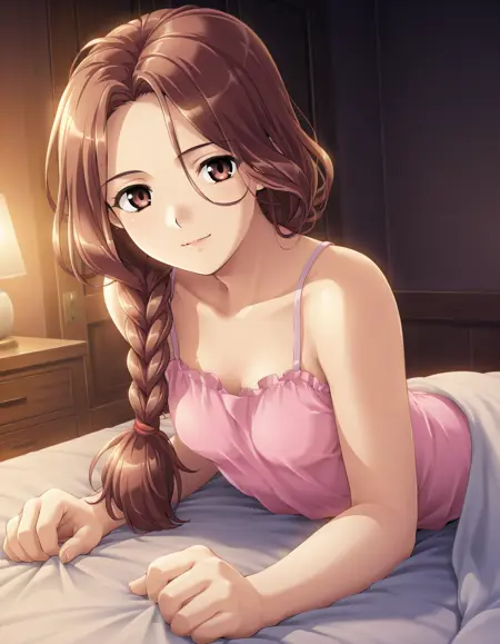tsurumaki kaname: t5urum4ki, pink camisole, single braid, side braid, see-through