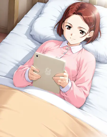 kaburagi chizue: chizue, red hair, hairclip, pink pajamas, long skirt