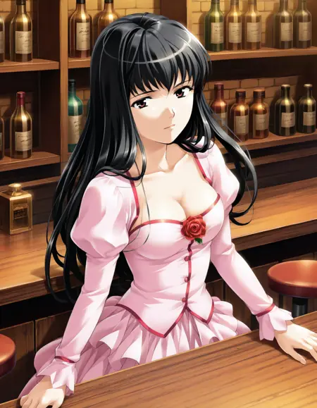 mimasaka sue: mimisaka, black hair, long hair, bangs, dress, (pink dress:0.6), juliet sleeves, cleavage, rose