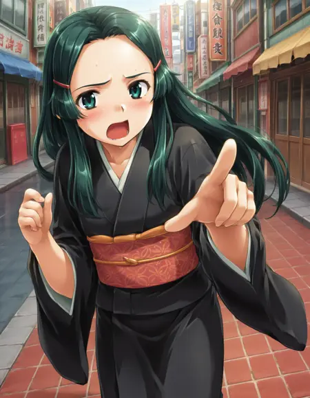 ifukube chika: ifukube, hairclip, long hair, black kimono