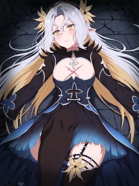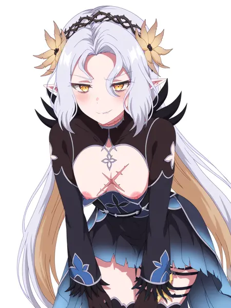 briar witch iseria, white hair, long hair, hair flower, hair ornament, pointy ears, yellow eyes, scar on chest, black dress, cleavage cutout, black thighhighs, gloves, small breasts