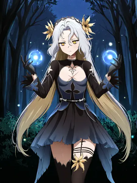briar witch iseria, white hair, long hair, hair flower, hair ornament, pointy ears, yellow eyes, scar on chest, black dress, cleavage cutout, black thighhighs, gloves, small breasts