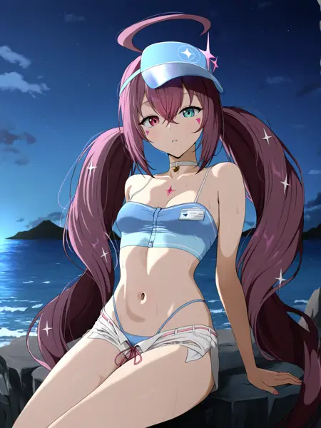 ocean breeze luluca \(epic seven\), 紫色头发,极长头发,双马尾,呆毛,红眼睛,蓝眼睛,异色瞳,面部纹饰,蓝色比基尼,短裤,遮阳帽
