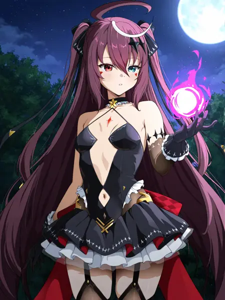 luluca \(epic seven\), purple hair, very long hair, two side up, ahoge, red eyes, blue eyes, heterochromia, facial mark, hair ornament, black dress, navel cutout, thighhighs, black gloves, garter straps