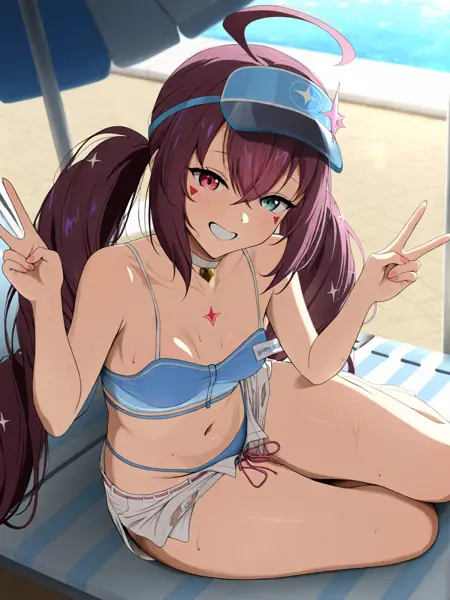 ocean breeze luluca \(epic seven\), purple hair, very long hair, twintails, ahoge, red eyes, blue eyes, heterochromia, facial mark, blue bikini, short shorts, visor cap