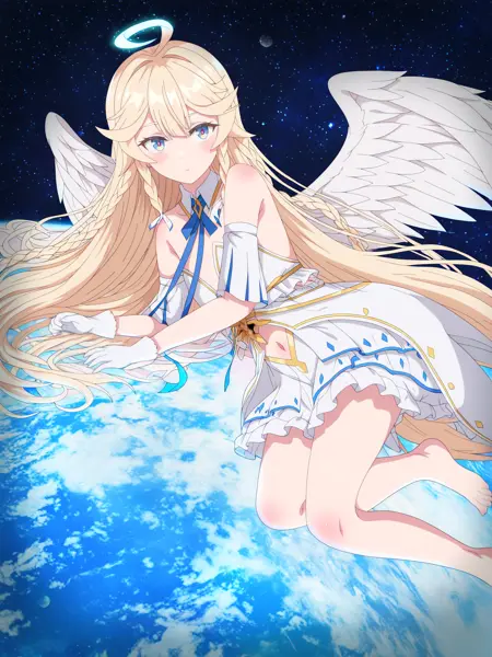 angel of light angelica \(epic seven\), blue eyes, multicolored eyes, blonde hair, very long hair, twin braids, bangs, ahoge, halo, angel, flat chest, white dress, navel cutout, detached collar, strapless, neck ribbon, bare shoulders, angel wings, barefoot