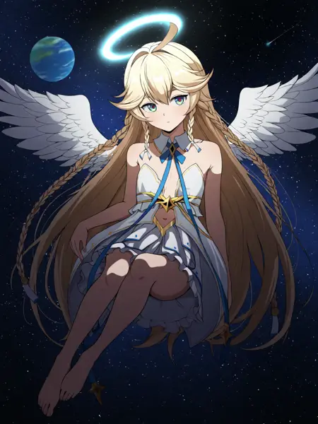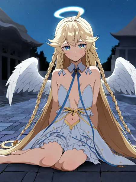 angel of light angelica \(epic seven\), blue eyes, multicolored eyes, blonde hair, very long hair, twin braids, bangs, ahoge, halo, angel, flat chest, white dress, navel cutout, detached collar, strapless, neck ribbon, bare shoulders, angel wings, barefoot