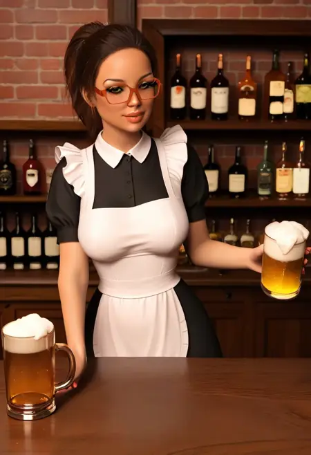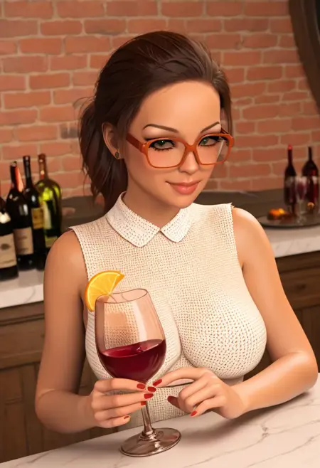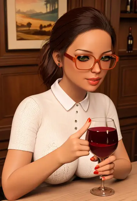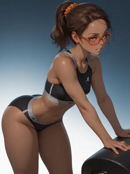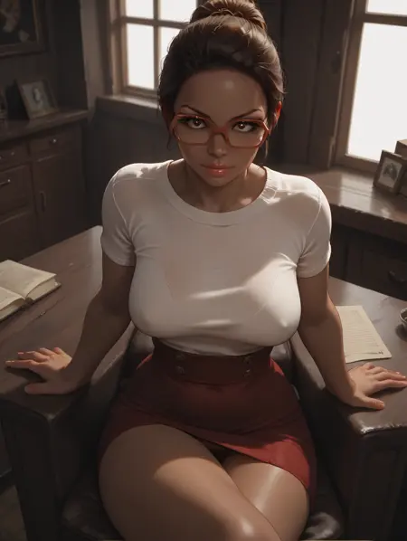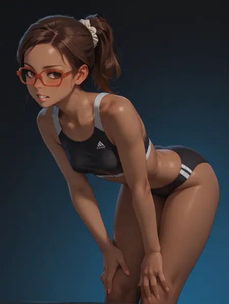 Anna, dark skin, dark-skinned female, ponytail, short hair, brown hair, red glasses,