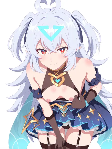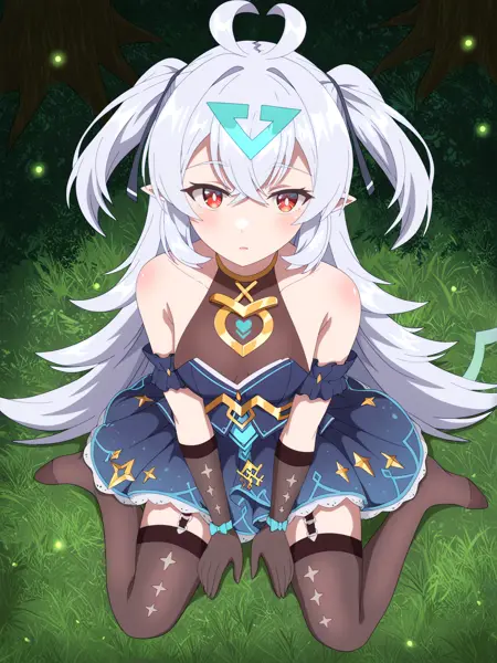 designer lilibet \(epic seven\), red eyes, long hair, two side up, hair ornament, pointy ears, ahoge, small breasts, blue dress, thighhighs, garter straps, elbow gloves