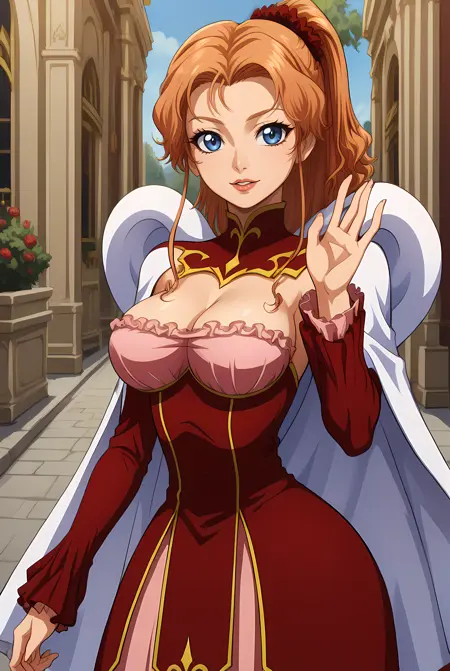 marrybell, half-up half-down hair, ponytail, strawberry blonde hair, blue eyes, make up, jewelry, red and pink and black floor-length gown, gold accents, white cape