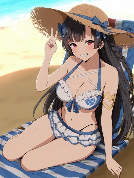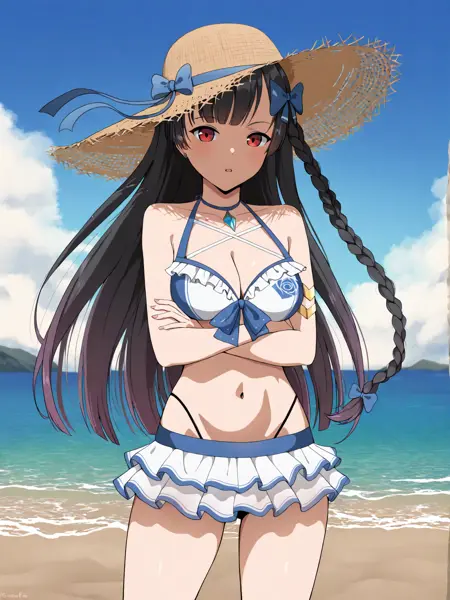 karin \(shore patrol\) \(epic seven\), black hair, long hair, blue bow, braid, red eyes, frilled bikini, bikini skirt, sun hat, straw hat, hat ribbon, armlet