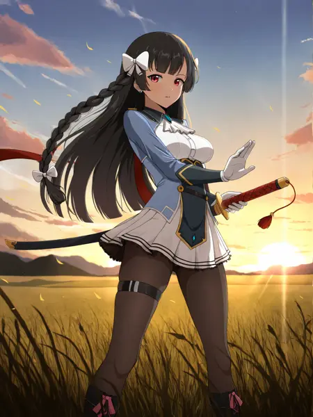 karin \(epic seven\), black hair, long hair, hair bow, braid, red eyes, pleated skirt, ascot, pantyhose, white gloves