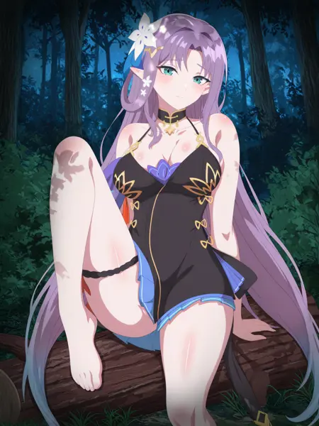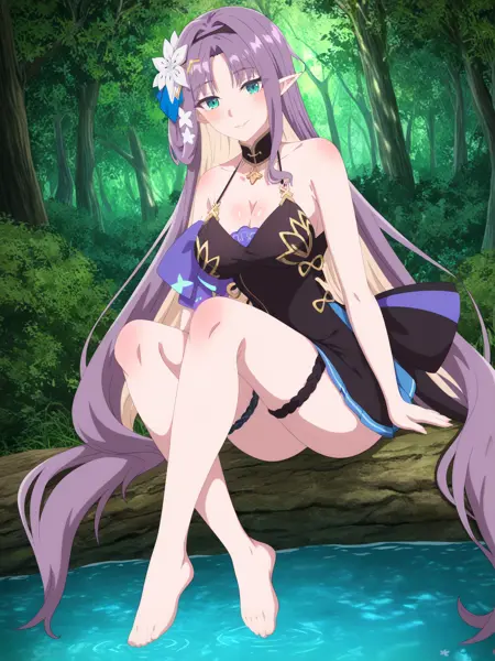 amid \(epic seven\), purple hair, long hair, aqua eyes, pointy ears, hair ornament, hair flower, short dress, bare shoulders, thigh strap