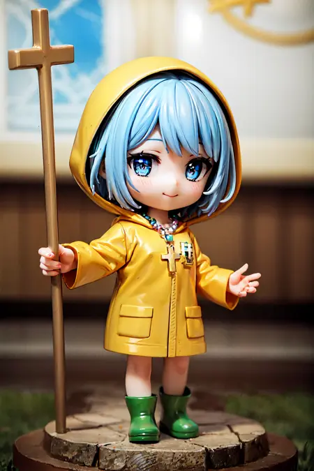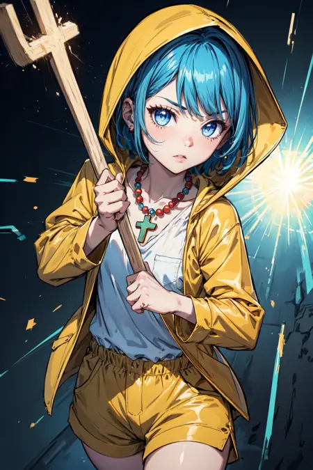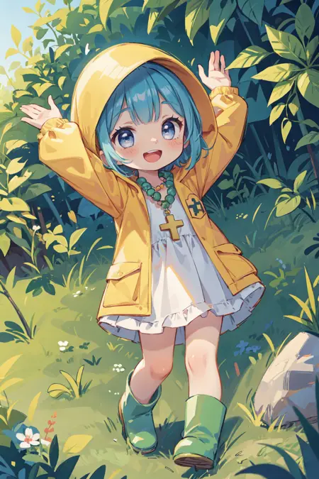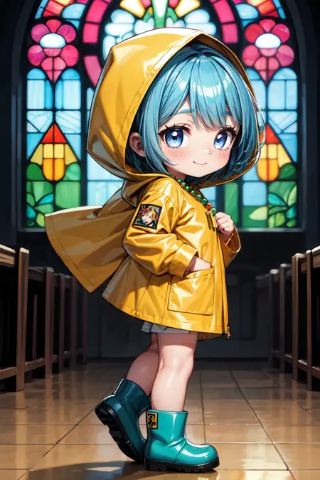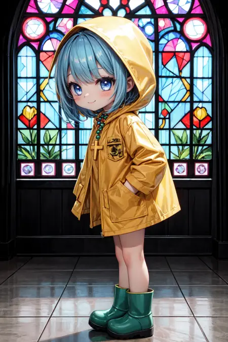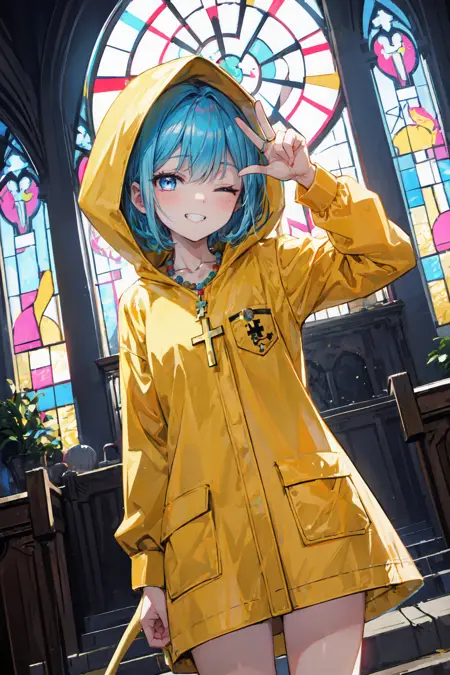 hood up, yellow raincoat, white shirt, long sleeves, pocket,