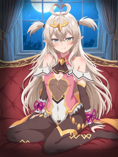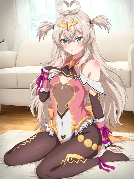 lilibet \(epic seven\), green eyes, long hair, two side up, hair ornament, pointy ears, heart ahoge, small breasts, leotard, covered navel, pantyhose, ribbon, bridal gauntlets