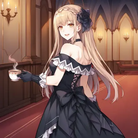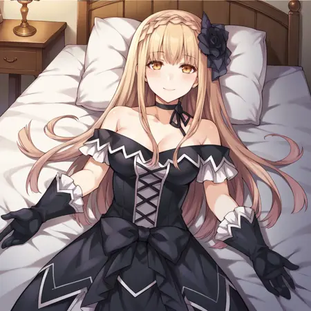 choker, black gloves, hair flower, black dress, ribbon choker, frilled dress, frilled gloves, frilled skirt, long skirt, black skirt, cross-laced clothes, off shoulder, off-shoulder dress, long dress, black bow, black ribbon, black flower