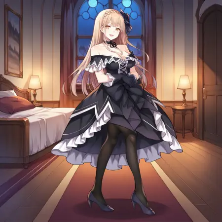 チョーカー, 黒の手袋, 髪の花, 黒いドレス, リボンチョーカー, フリル付きドレス, フリル付き手袋, フリルスカート, 長いスカート, 黒いスカート, 交差リボン装飾, 肩出し, オフショルダードレス, 長いドレス, 黒いリボン, 黒いリボン, 黒い花