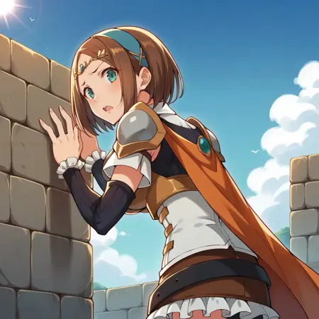 armor、 shoulder armor、 black belt、 gold trim、 knee pads、 white thighhighs、 bare shoulders、 orange cape、 short sleeves、 pleated sleeves、 detached sleeves、 sleeveless shirt、 collared shirt、 white shirt、 black shirt、 red shirt、 multicolored shirt、 yellow necktie、 cleavage cutout、 chestplate、 white corset、 jewelry、 frilled skirt、 black shorts、 brown skirt、 black arm warmers、