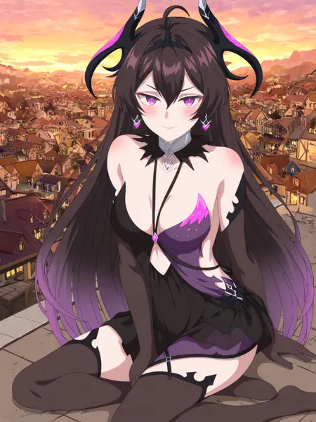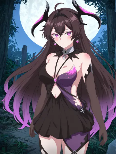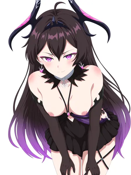 specter tenebria \(dark tyrant\) \(epic seven\), purple eyes, black hair, purple hair, long hair, bangs, earrings, medium breasts, ahoge, tiara, horns, dress, elbow gloves, cleavage, bare shoulders, clothing cutout