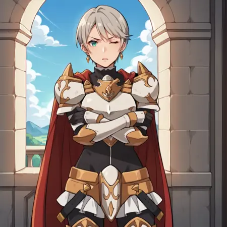 갑옷, 어깨갑옷, 팔뚝갑옷, 전갑, 흰 치마, 주름치마, 검은 장갑, 갑옷 부츠, 허벅지 부츠, 금장식, 금 무릎 보호대, 검은 팬티스타킹, 검은 코르셋, 벨트, 흰 망토, 빨간 안 망토, 흰 갑옷, 터틀넥, 장갑,