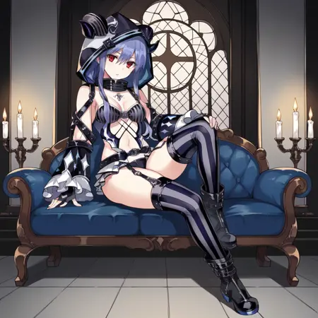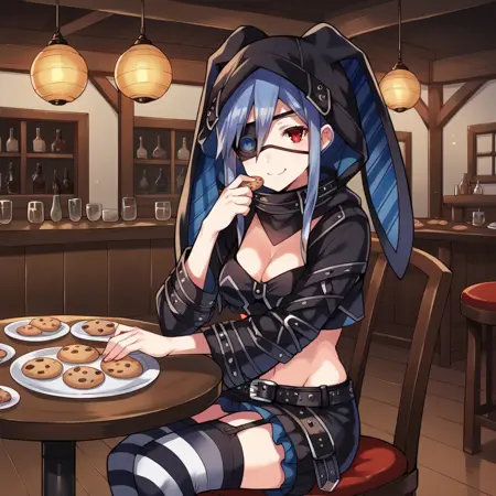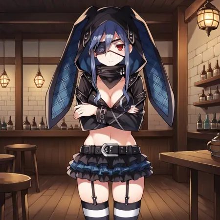 El_Alt, 眼罩, 横条纹过膝袜, 动物帽兜, 备用条纹过膝袜, 露腹, 黑色上衣, 短款上衣, 暴露胸部, 高领, 胸部镂空, 备用夹克, 备用短夹克, 黑色夹克, 黑色袖子, 长袖, 备用带帽夹克, 帽兜向上, 兔耳朵, 吊袜带, 备用荷叶边短裙, 层叠裙摆, 黑色裙子, 蓝色裙子, 黑色腰带,
