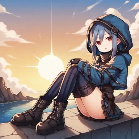 El_Def, 竖条纹过膝袜, 条纹过膝袜, 胸衣外穿, 深蓝色胸衣, 黑色连衣裙, 荷叶边连衣裙, 荷叶边短裙, 短裙, 黑色腰带, 拉链, 短夹克, 蓝色夹克, 长袖, 蓝色袖子, 高领, 黑色肩带, 带帽夹克, 无指手套, 黑色手套, 蓝色帽兜, 帽兜向上,