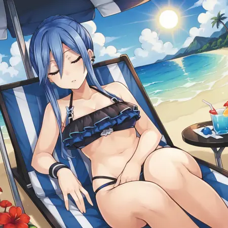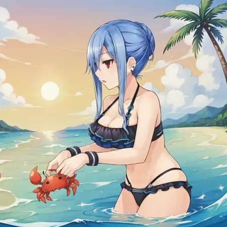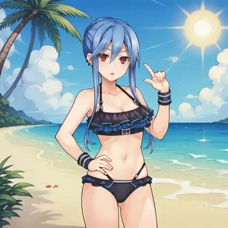 趣味小知识: 据我所知,游戏中的泳装只是普通的学校泳装,但Compile Heart工作室的官方画师“Tsukako”曾绘制过一款荷叶边比基尼的图稿,而我找到的唯一一张图是eBay上可购买的海报。就连Google Lens也无法在别处找到这张图……所以,我就是基于那张图制作的。效果不错。