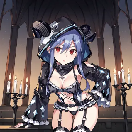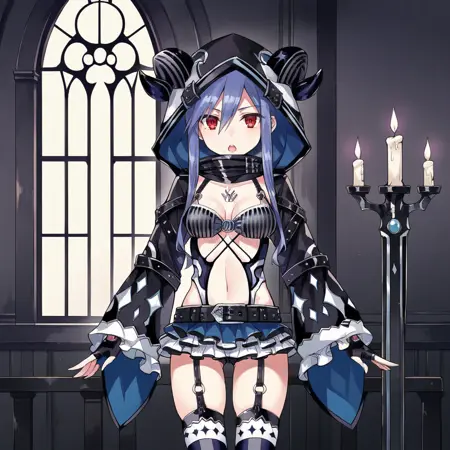 El_Meg, 备用竖条纹过膝袜, 备用吊袜带, 露肤服装, 条纹胸衣, 肩带, 高领, 备用动物帽兜, 角, 荷叶边袖子, 备用无指手套, 侧边镂空, 备用黑色手套, 交叉系带, 中部开洞, 中部镂空, 备用长袖, 宽袖, 备用黑色袖子, 蓝色连衣裙, 荷叶边连衣裙, 短款连衣裙, 肚脐镂空, 备用黑色腰带,