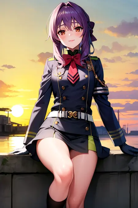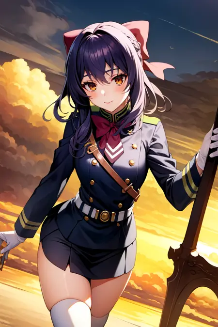 Hiiragi Shinoa: hiiragi shinoa, 1girl, military uniform, purple hair, hair bow, gloves, skirt, thighhighs