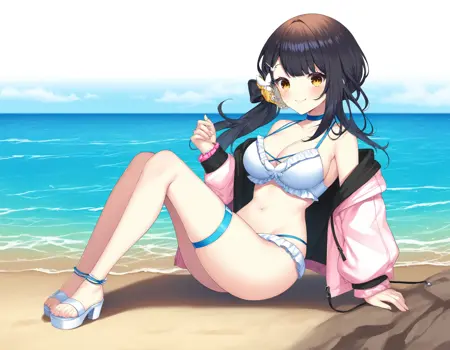 cleavage, pink hoodie, black jacket, clothes down, frilled bikini, pink wrist scrunchie, white sandals, thigh strap, ankle strap,
