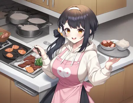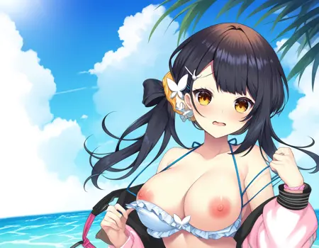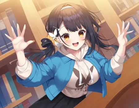 crystkomari, black hair, single low side ponytail, long hair, yellow eyes, large breasts, hair ornament, butterfly hair ornament, blue hairclips, white hairclip, hair intakes,