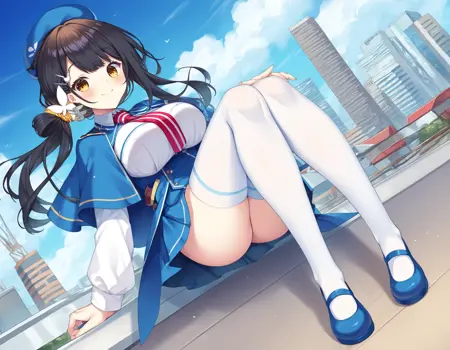 blue beret, black ribbon, blue and white school uniform, blue capelet, blue pleated skirt,red necktie, blue shoes, white thighhighs, zettai ryouiki,