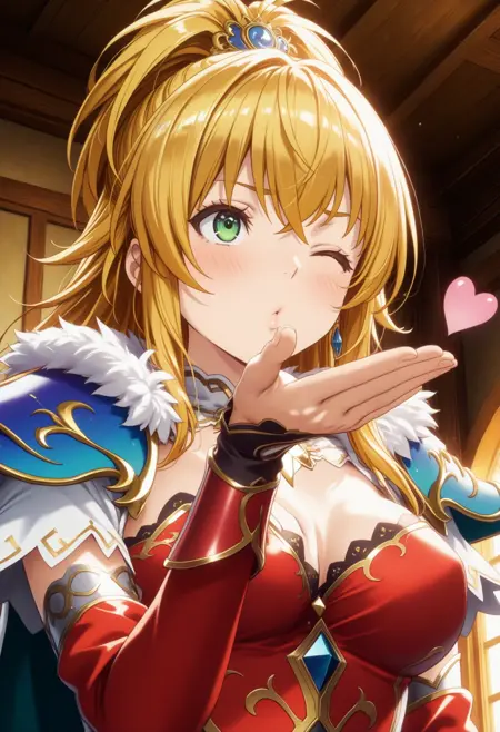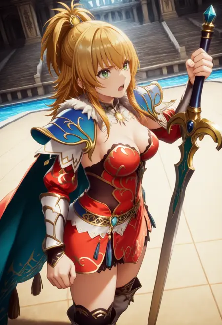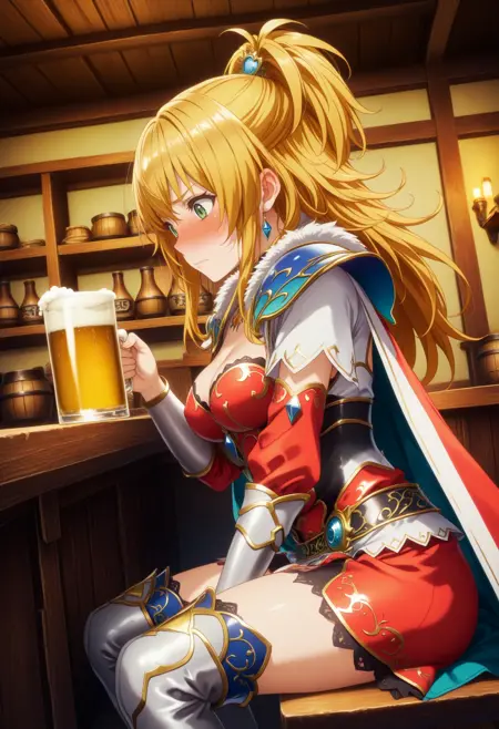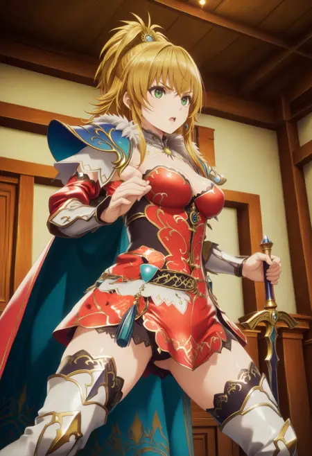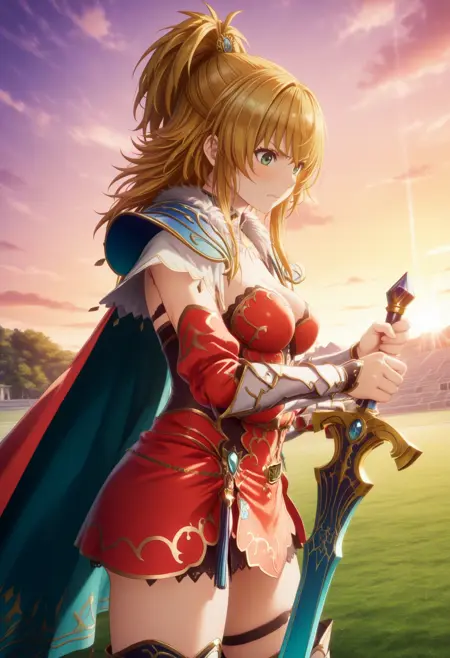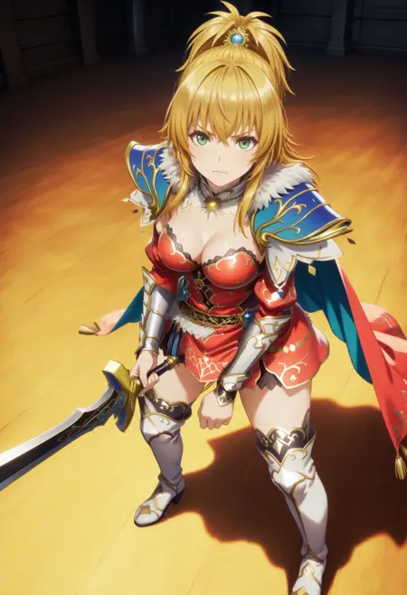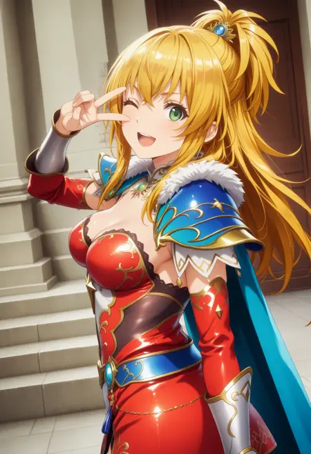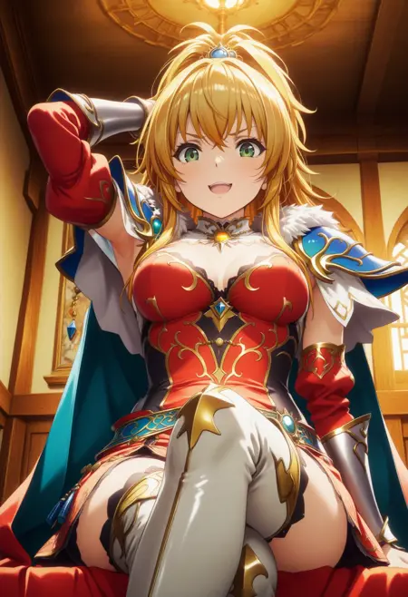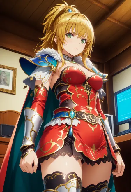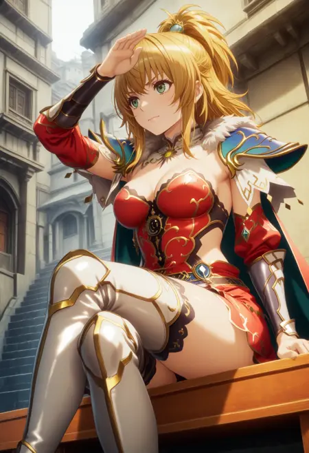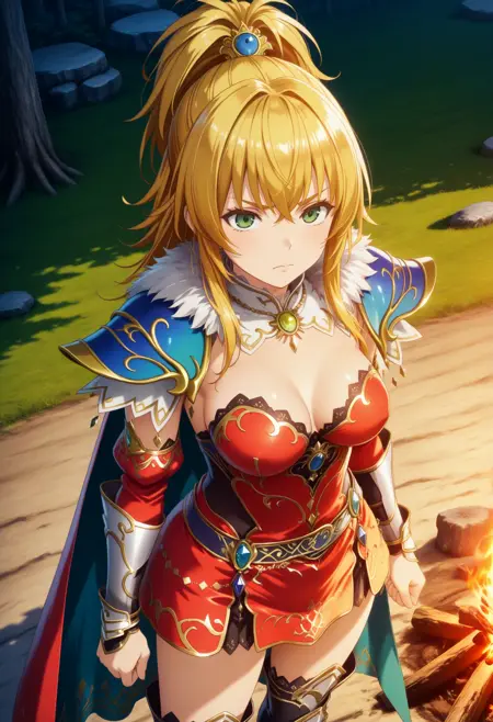 トリガーだけでもある程度再現されますが、green eyes, blonde hair, cape, armor, thigh boots, long hair, short dress, medium breasts, ponytail, hair ornament, detached sleeves, shoulder armor, fur trim といったプロンプトを追加すると、望む画像の再現が安定します。