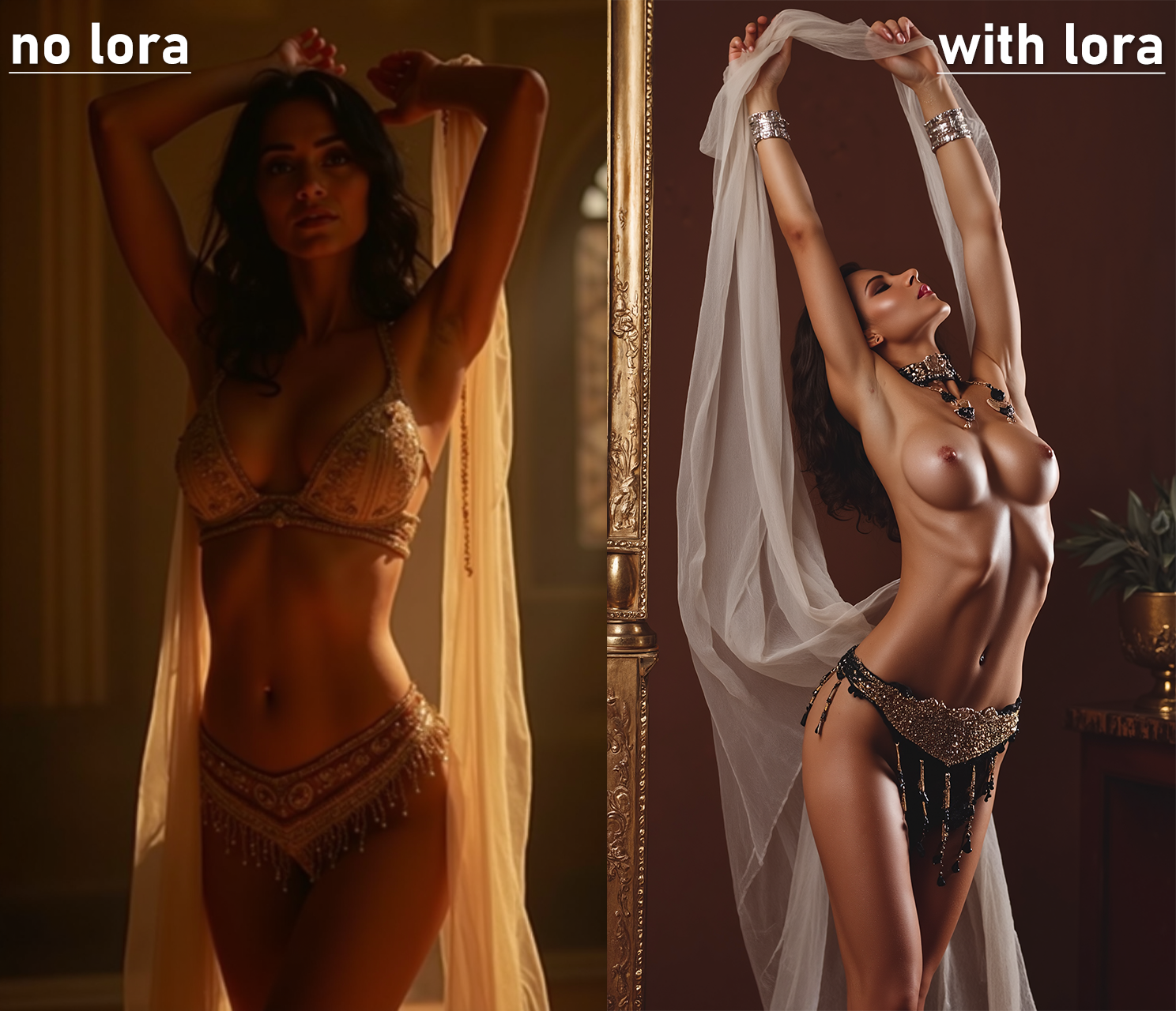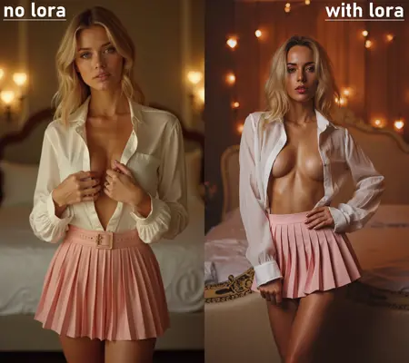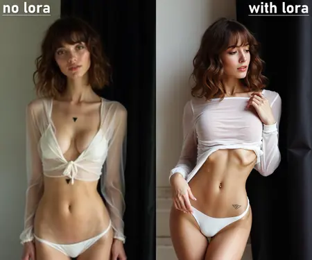 생성된 이미지에는 그의 스타일이 잘 표현됩니다: 슬라브계 모델, 말라붙은 얇은 허리, 몸에 뚜렷한 근육선이 있는 아름다운 체형, 아름다운 색조의 광택 나는 피부, 우수한 명암 배치, 사진가의 특징적인 후처리, 높은 허리선의 란제리.