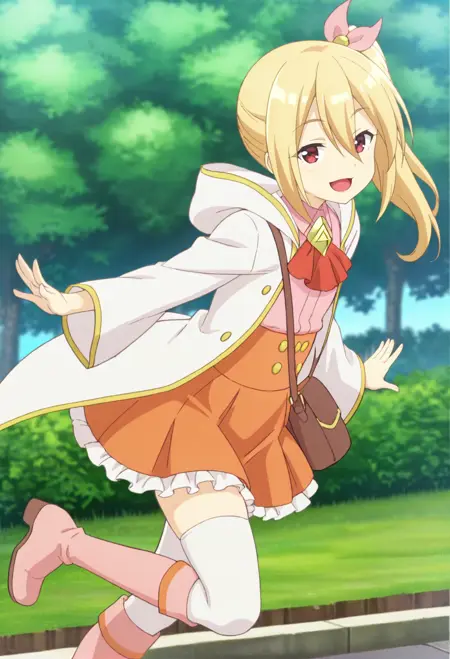 frederica-default,frederica \(bofuri\),red eyes,blonde hair,side ponytail,hair ribbon, white hoodie,pink shirt,ascot,orange skirt,frilled skirt, pink knee boots,white thighhighs,shoulder bag