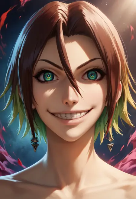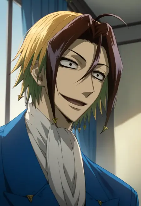 我加入了来自剧集的各种元素,但没有使用任何粉丝艺术,因为艺术风格不一致。锐利的手套已包含在内,添加手套后,再添加爪子和带爪武器即可。我还加入了他那傻乎乎的表情,只需添加“derp face”。如果再加一个 tag meme 可能会更搞笑。我加入了他假装出来的友善表情,只需添加“facade”并移除“ringed eyes”。这些均仅基于剧集截图制作,因此你可能希望将文字和字幕加入负面提示词。此外,tag “sharp teeth” 应该能适用于他标志性的邪恶笑容。