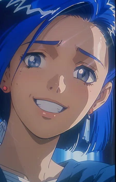 student_aod2, 1girl, solo, 复古艺术风格, 蓝发, 耳环, 饰品, 蓝眼, 1990年代风格百褶裙