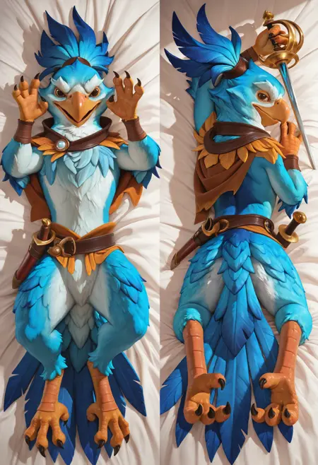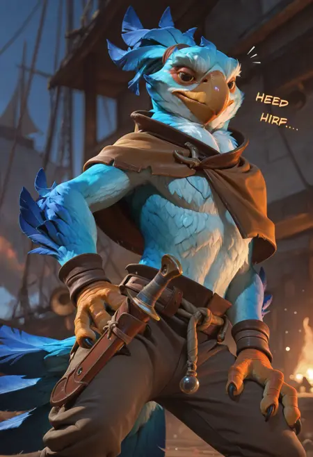 kez_dota, avian, bird, solo, 1boy, male focus, anthro, furry, blue feathers, beak, looking at viewer, sword sheath, clothed, capelet